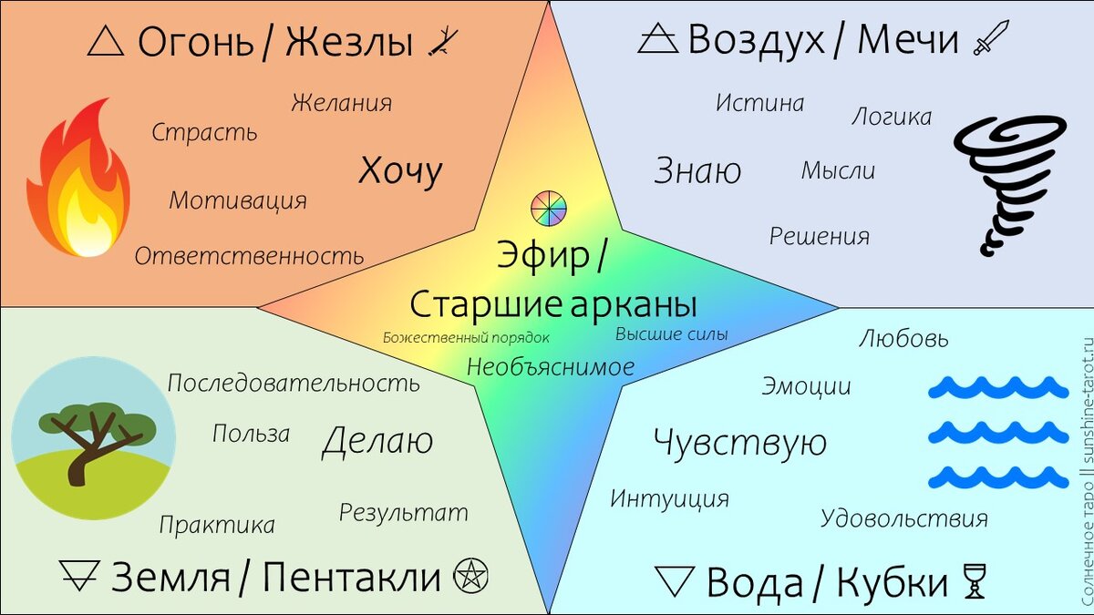 Мечи — это наш ментальный план. То, что мы думаем. Направление наших мыслей. Качество наших мыслей. Ум — это продукт эго. И если мы живём в одном лишь уме, то уходим очень глубоко и надолго в эго, теряя контакт с миром. Эго порождает разделённость, одиночество, осуждение, выделение себя, негативные зацикленные программы, которые закрывают нас от мира… И эту картину мы и видим на пути масти Мечей.